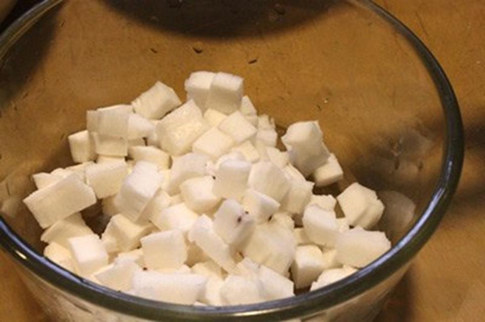 Tiếp đến, thái cơm dừa thành những miếng nhỏ vuông vức để khi cho vào máy xay sinh tố dễ xay hơn.